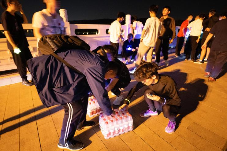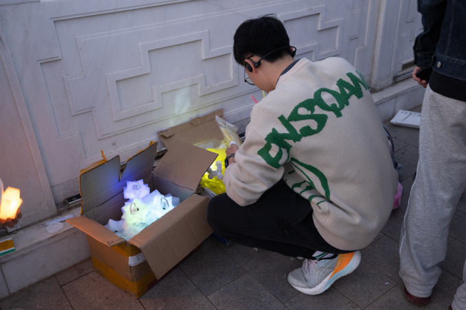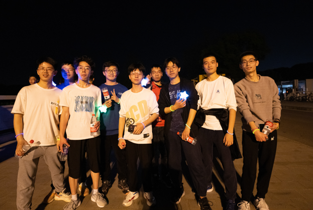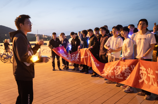 为了帮助同学舒展身体,防止出现不必要的运动损伤,工作人员带领同学们进行了出发前的热身运动。为同学们分发荧光棒,夜的笼罩下,耀眼的不只有星光,还有同学们手中的光!