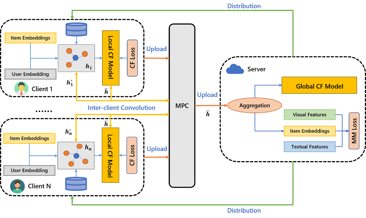 丁轩昂同学的论文针对联邦多媒体推荐面临的两个问题,即(1)多媒体上下文的高维性限制了资源受限的用户设备上的联邦优化和(2)联邦推荐系统中客户端数据的本地存储产生了异构的分布,提出了一种资源高效且安全的多媒体推荐联邦学习框架(FedMMR)。为了降低客户端的资源消耗,该方法将多模态学习模型拆分到强大的服务器,客户端训练轻量级的协同过滤模型,仅需本地模型和项目表示在服务器和客户端之间传输。该方法进一步提出了一种客户端间卷积策略,利用安全多方计算来保证用户隐私,同时减轻客户端之间的异构性。实验在三个数据集进行评估,验证了FedMMR有效地利用了项目的模态特征来提高性能,同时显著降低了客户的通信和计算成本。