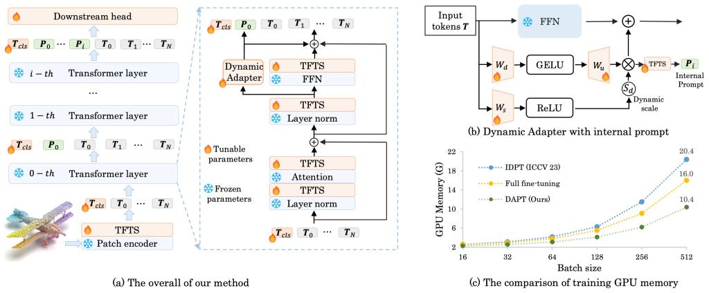 在白翔教授的指导下,周鑫系统学习了3D视觉的相关知识,专注于面向点云分析的参数高效迁移学习任务,经过系统的实验论证,提出了一种轻量动态适配器结构,并构建了基于模型内部特征的提示微调策略。周鑫仅对提出的模块进行优化,显著减少了95%的可训练参数,节省了50%的训练显存,同时能保证模型性能几乎不受到影响,有效降低了端侧模型的部署成本。