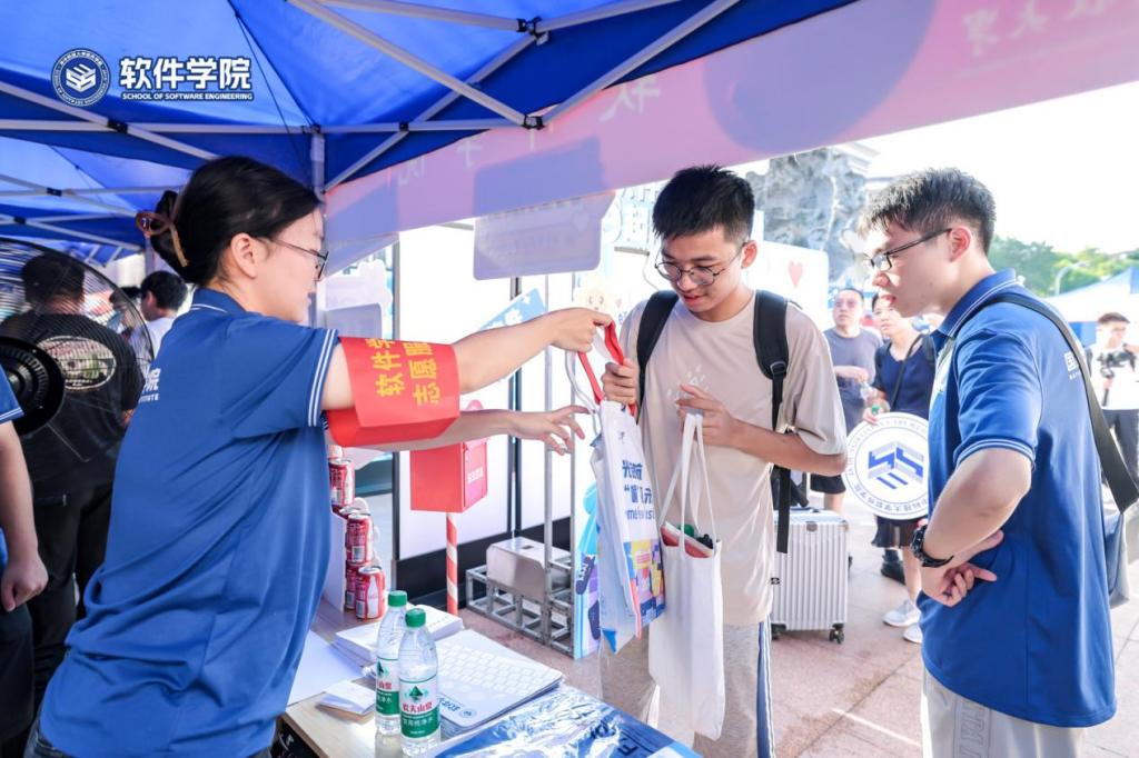 在迎新点,志愿者们为新生们送上专属新生大礼包,热情解答新生的问题。