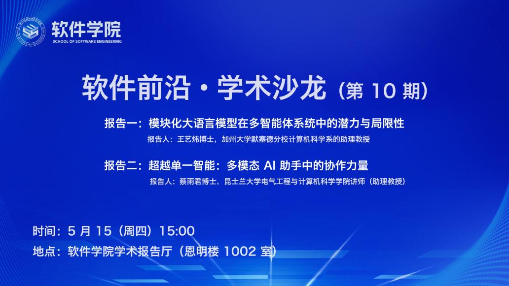 2025年5月15日下午,“软件前沿·学术沙龙”第十期在公司1002学术报告厅圆满举行。本期活动以“人工智能前沿技术”为主题,特邀加州大学默塞德分校计算机科学系助理教授王艺炜博士和昆士兰大学电气工程与计算机科学公司助理教授蔡雨君博士担任主讲嘉宾,展开深度分享。活动由304永利集团经理助理郭连波教授主持,吸引了众多师生参与,现场学术氛围浓厚。