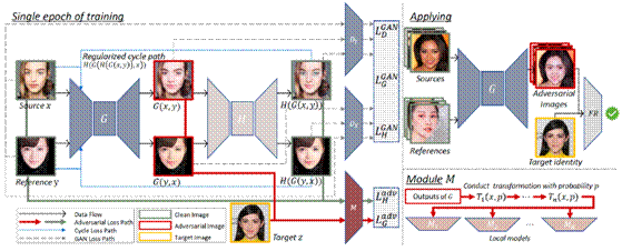 该工作提出了AMT-GAN。利用生成对抗网络(GAN)从参考图像中合成具有妆容效果的对抗性人脸图像,不仅保留更强的黑盒迁移性,而且拥有更好的视觉质量。提出一种新的正则化模块和联合训练策略去调和妆容迁移中的对抗噪声和cycle consistence loss之间的冲突,以达到攻击强度和视觉效果的平衡。广泛的实验表明,与现有方法相比,AMT-GAN不仅可以保持较高的视觉质量,而且在商业人脸识别API(包括Face++,Aliyun和Microsoft)上实现了更高的攻击成功率。