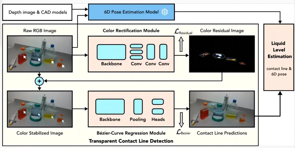 在AI赋能的智能生物医学实验室中,准确估计容器内透明液体的高度对于液体分配、吸取和混合等实验任务至关重要。现有方法仅关注固定视角下的单个实例,与实际应用场景有较大差距。为此,夏教授团队提出了一种新的双透明液位高度估计Benchmark,包括数据集、方法和实践,提出的DTLD (Dual Transparent Liquid Level Estimation Dataset) 数据集包含27,458张图片,涵盖四种透明生物医学实验器皿,涉及多个视角。基于DTLD,团队提出了一种端到端的学习方法来检测液位接触线(Contact Line)并估计液位。为提高检测鲁棒性,还提出了一个液面修正模块。实验证明,此方法将液位估计的平均绝对百分比误差减少了43.4%。