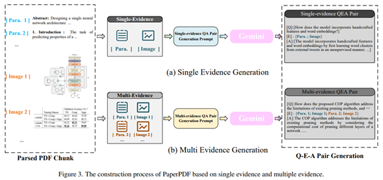 为了克服现有数据集局限于单页文档或单一证据问题的缺陷,论文还提出了一种高质量问答对生成方法,并据此构建了PaperPDF数据集。