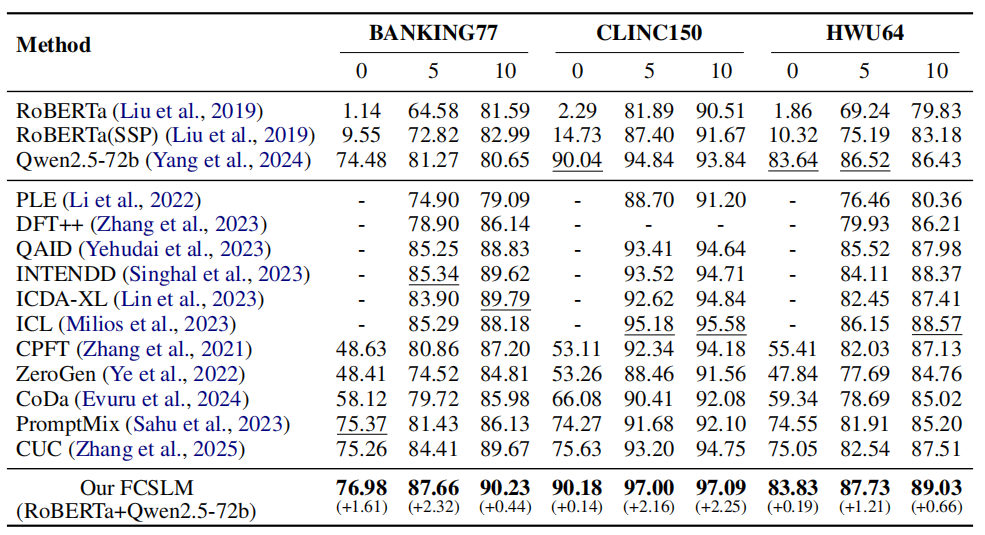 小样本意图检测(FSID)是对话系统中的一项核心且富有挑战性的任务,它旨在仅用少量标注样本对用户查询进行意图分类或识别为范围外(OOS)。现有的小模型(如PLMs)方法在数据稀疏时性能不佳,而新兴的大语言模型(LLM)方法虽能力强大,却面临着推理成本高昂和多类别干扰等实际应用瓶颈。为融合两者的互补优势,该工作提出了一种创新的大小模型协同框架(FCSLM)。该框架在训练阶段利用大模型进行数据增强,以有效训练一个任务专属的小型预测模型。在推理阶段,设计了一个多轮协同推理流程:首先由小模型高效处理绝大多数预测任务并给出候选意图;仅当预测置信度不足时,才调用大模型,利用其强大的语义理解能力进行二次精准判别和范围外检测。大量实验结果表明,所提方法在三个权威基准数据集上的意图分类和OOS检测任务中均显著超越了现有最强基线,取得了全新的SOTA(state-of-the-art)性能,为解决低资源场景下的意图识别问题提供了高效、精准的新范式。