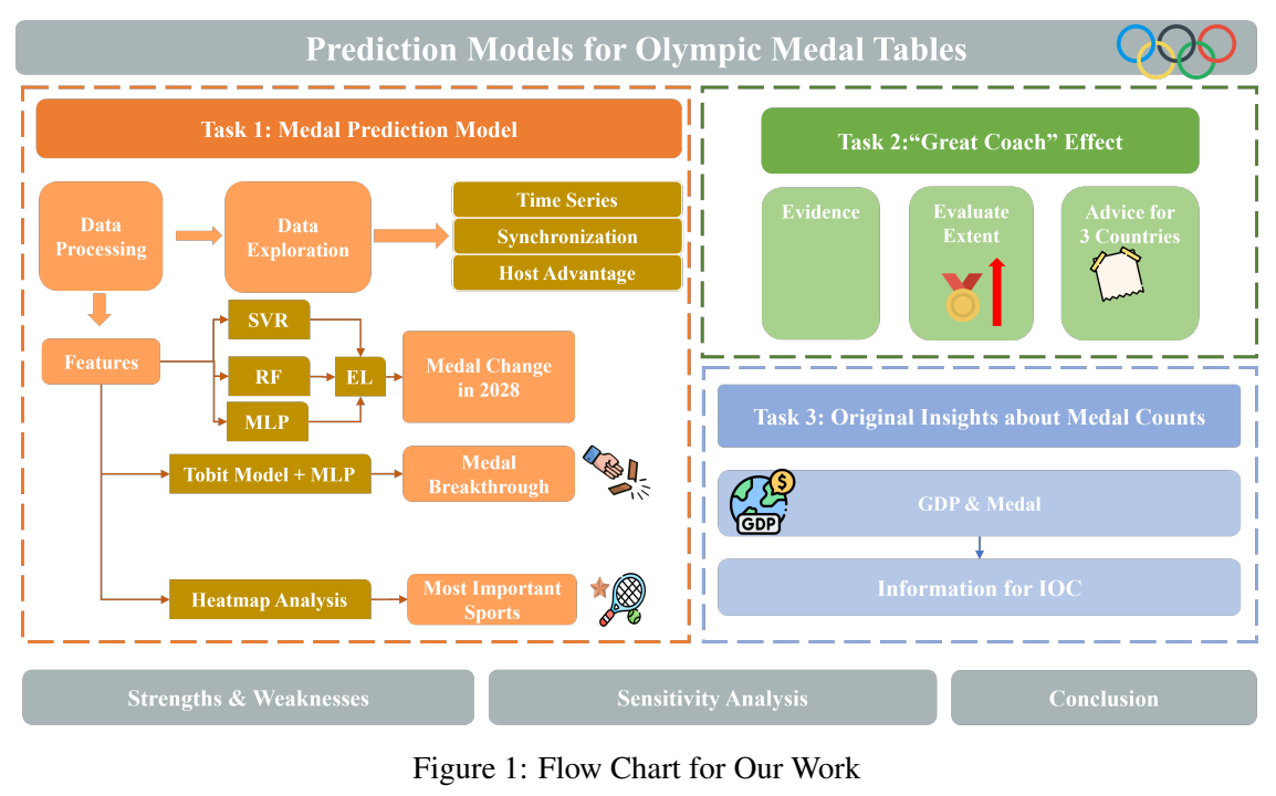 团队采用集成学习(支持向量回归、随机森林、多层感知机)与Tobit-MLP混合架构,构建了多维度奥运竞赛分析模型。通过特征融合与截断数据建模技术,系统实现了对各国奖牌分布的动态预测、新兴国家突破概率评估以及教练资源效应的量化分析。模型创新性地结合监督式学习与受限因变量建模,在保障预测鲁棒性的同时,提升了数据小样本国家的评估精度,为竞技体育发展规律提供了可解释的数据预测。