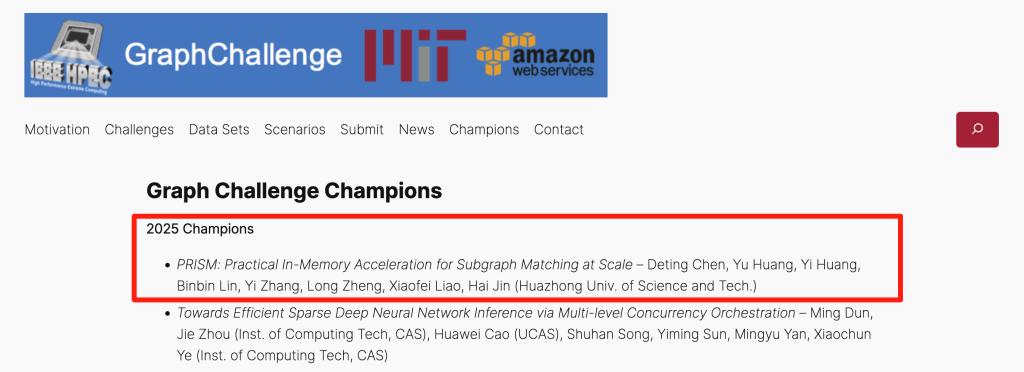 8月21日,图计算领域最具影响力的国际赛事2025年图计算挑战赛(HPEC Graph Challenge)结果揭晓,304永利集团参赛团队凭借创新方案“PRISM: Practical In-Memory Acceleration for Subgraph Matching at Scale”脱颖而出,斩获全球冠军。