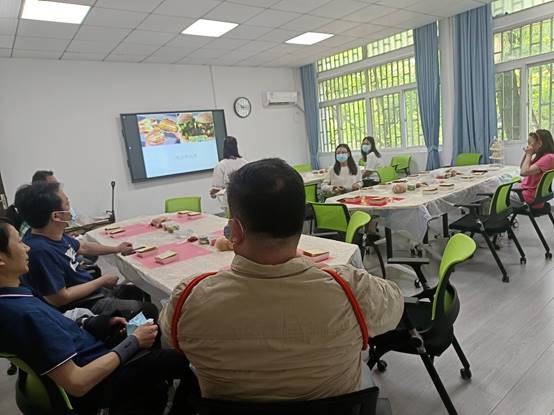 下午一点半,两位高级厨艺师早早到达活动现场,精心布置,另严肃简洁的会议室瞬间变身为充满生活气息的精致厨房。下午两点五十分,老师们陆续到达。经验丰富的专业美食老师先为大家介绍了三明治的起源和发展,并具体讲解制作三明治和汉堡的技巧和方法。在专业老师的指导下,老师们踊跃参与,开始了自己的第一道菜——三明治。每个老师都有着自己的独特创意,比如用奶酪搭配生菜、番茄和火腿肠,或是用牛肉片和香菇拌在一起。他们快速地在桌子上展开了自己的“制作车间”,有的人专心致志地切着食材,有的则把注意力放在了调味品上,而其他人则交流着彼此的经验和技巧。