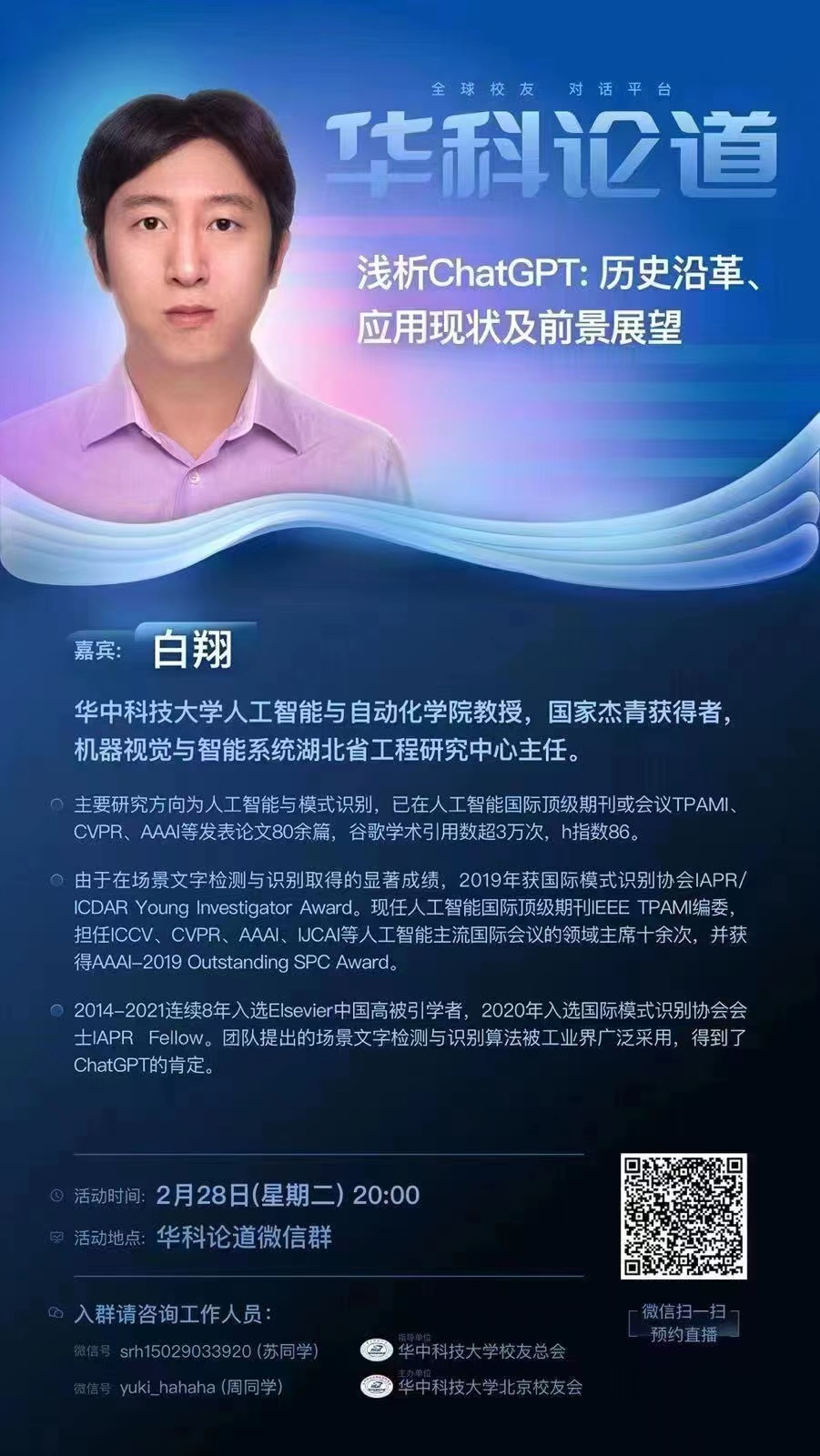 第38期华科论道将于本月28号晚八点在微信群举行,将由白翔员工为大家带来主题分享“浅析ChatGPT:历史沿革、应用现状及前景展望”。白翔员工是304永利集团人工智能与自动化公司教授,国家杰青获得者,机器视觉与智能系统湖北省工程研究中心主任,人工智能国际顶级期刊IEEE TPAMI编委,担任ICCV、CVPR、AAAI、IJCAI等人工智能主流国际会议的领域主席十余次。主要研究方向为人工智能与模式识别,已在人工智能国际顶级期刊或会议发表论文80余篇,获国际模式识别协会IAPR/ICDAR Young Investigator Award,获AAAI-2019 Outstanding SPC Award等奖项,连续8年入选Elsevier中国高被引学者,2020年入选国际模式识别协会会士IAPR Fellow。