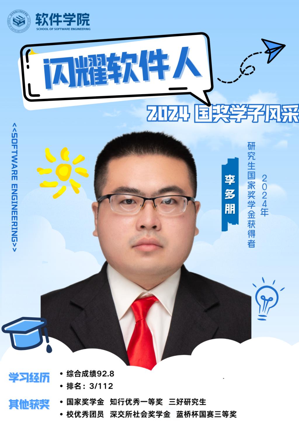 李多朋,来自软件工程硕士2202班。综合成绩92.8,排名:3/112,曾获国家奖学金、知行优秀一等奖、三好研究生、校优秀团员、深交所社会奖学金、蓝桥杯国赛三等奖等荣誉。
