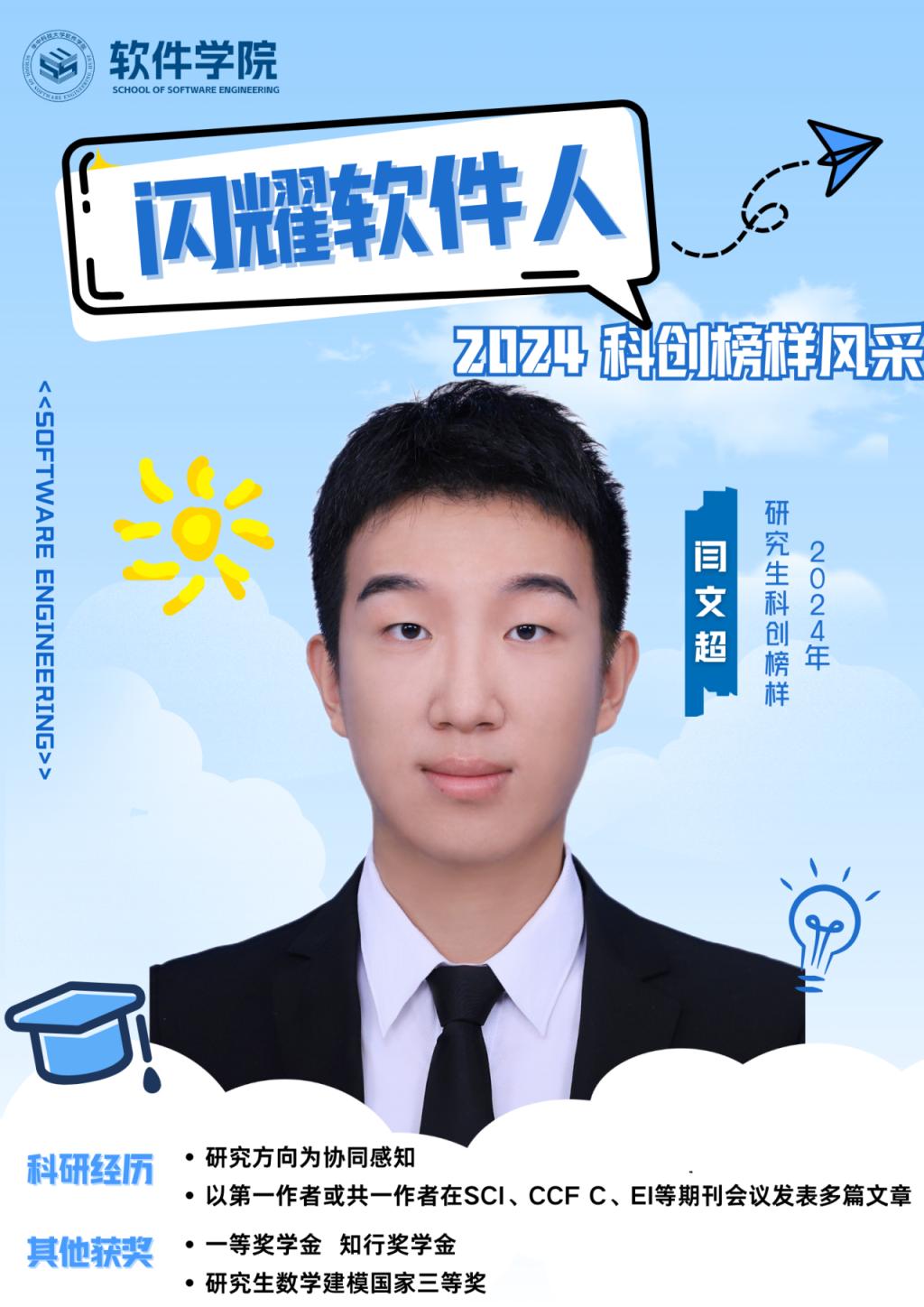 闫文超,来自2202班。曾获得两次一等奖学金、知行奖学金、研究生数学建模国家三等奖等荣誉。研究方向为协同感知,以第一作者或共一作者在SCI、CCF C、EI等期刊会议发表多篇文章。