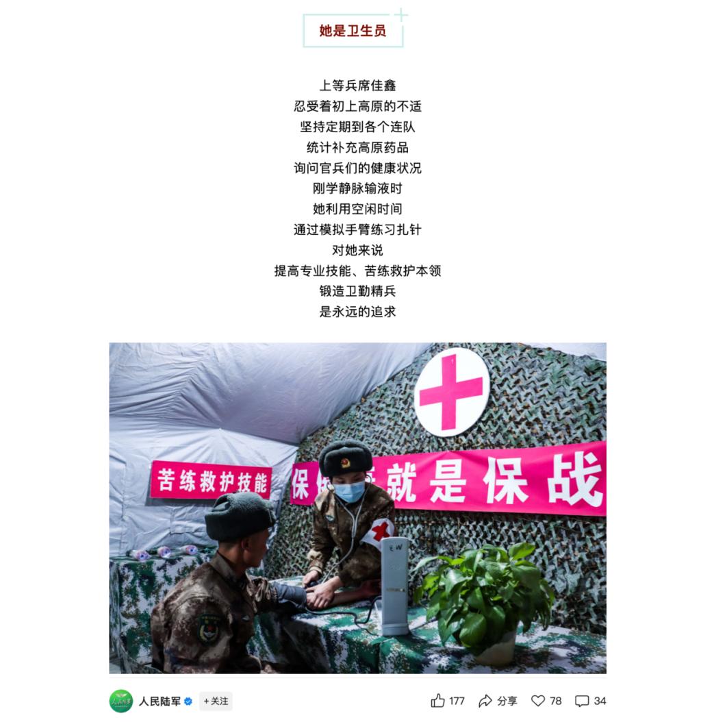 服役期间,她随所在部队前往喀喇昆仑高原执行专项任务,坚守在海拔5200米、极寒缺氧的高原战位,驻守时间长达10个月。作为卫生员,她参与野战救护所千人次体检、40余次巡诊,累计护理病号超千人次。在专业技能考核中屡屡名列前茅,以扎实本领保障官兵健康。